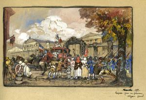 RÉVOLUTION.Dessin gouaché représentant le transfert de Louis XVI de Versailles à Paris. XXe siècle ; 380 X 240 mm. La scène représente le carrosse entouré de révolutionnaires sortant de la cour du château de Versailles. Dans le bas à droite : « Versailles, 1789. Esquisse pour un panneau. Azam Gabriel ». Scène intéressante.