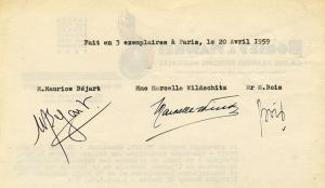 BÉJART MauricePièce signée avec annotation autographe signée « M. B ». 1 page in-folio. « Je […] m’engage à ce jour […] à ne plus utiliser à l’avenir pour mes représentations les bandes magnétiques sur lesquelles étaient enregistrées, les musiques de Bartok, Strawinsky et Copland des oeuvres intitulées : « Sonate pour deux pianos et percussion » « Pulcinella » et « El salon de Mexico » et à détruire ces bandes. »