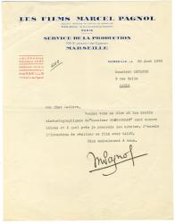PAGNOL MarcelLettre dactylographiée signée, adressée à M. Leclere à Paris. Marseille, 22 août 1938 ; 1 page in-4°. En-tête imprimé « Les Films Marcel Pagnol, Service de Production ».« Mon cher Leclere, Voulez-vous me dire si les droits cinématographiques de « Monsieur Brotonneau » sont encore libres et à quel prix je pourrais les acheter. J’aurais l’intention de réaliser ce film avec Raimu. »Le film en question est bien sorti le 4 août 1939, produit par la société de Marcel Pagnol, réalisé par Alexander Esway, avec Raimu dans le rôle principal.