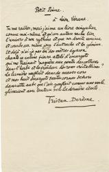 DERÈME Tristan (Philippe Huc, dit)Poème autographe signé. « Petit Poème à Léon Vérane. » 1 page in-8°. « Tu me railles, mais j'aime un livre singulier Comme moi-même et qu'un auteur sache lier L'univers à son rythme et que sa droite unisse Et courbe au même joug l'autruche et la génisse. Et déjà n'ai-je pas en des mètres égaux Chanté ce calme fiacre attelé d'escargots Qui me traînait naguère aux pentes des collines Dans l'herbe et la fraîcheur des roses cristallines? La lumière soufflait dans de suaves cors Et mes huit escargots toutes cornes dehors Dans cette aube que l'air gonflait comme une voile Glissaient avec lenteur vers la dernière étoile. Tristan Derème. » Paru dans La Verdure dorée, Éditions Émile-Paul frères, 1922.