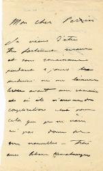 BRAZZA Pierre Savorgnan deLettre autographe signée, adressée à son « cher Perrin ». «13 mars » ; 1 page 1/2 in-8°. « Je viens dêtre très fortement secoué et sans connaissance pendant 3 jours les médecins ne me laisseront lever avant une semaine et sil narrive des complications. Cest pour cela que je ne vous ai pas donné de mes nouvelles. »