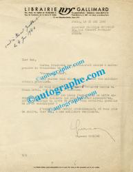 QUENEAU RaymondLettre signée, adressée à Philippe Soupault. Paris 28 mai 1946 ; 1 page in-4°. En-tête « Librairie NRF Gallimard ». Sur la traduction de Finnegans Wake, que Gallimard est tout-à-fait décidé à entreprendre « Vous pouvez donc commencer à sonder vos collaborateurs possibles ». Il suggère le nom de Stuart Guilbert, et demande « un des éléments qui nous seraient nécessaires, est le calibrage du livre de Joyce. Vous serait-il possible de nous le communiquer ? » En tête de la lettre, Soupault a noté qu’il a écrit à Stuart Guilbert.