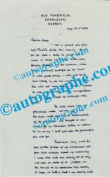 SWINNERTON FrankLettre autographe signée, adressée à M. Green. Old Tokefield, Cranleigh, Surrey, 31 mai 1954 ; 1 page 1/2 in-12. « I had a pencil note from Mrs. Pauline Smith this morning. She is so ill that I think it would not be kind to bother her about letters from Arnold Bennett. If she recovers, which seems extremely doubtful as her heart is under great strain, I will ask her on your behalf if she has anything for you. She will not have letters, because I believe it was a consideration of their correspondence that the letters should be destroyed when read […]. Thank you very much for your further praise of my introduction and your kind remarks about my handwriting. I have lived with this writing for so long and seen so much of it […] that I am heartily sick of its appearance ».