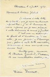 DAURAT DidierLettre autographe signée, adressée à un secrétaire général. Villiers-sur-Marne, 4 juillet 1962 ; 1 page in-8°. Sur une cérémonie à la gloire de l’aviation: « J’ai l’honneur de vous informer que je serai présent à votre cérémonie du samedi 7 juillet. C’est avec un sentiment de fierté et d’émotion, qu’à vos côtés, je me joindrai à l’hommage qui, grâce à votre belle association sera rendu à ceux auxquels nous devons tous ».