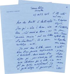 DRUON MauriceLettre autographe signée [adressée à J. Carcopino]. 27 octobre 1968 ; 4 pages in-8°.« Pour qui a vécu à Rome, aime Rome, s’est nourri de Rome, vos “Souvenirs romains” sont une lecture d’enchantement. Et de douce nostalgie, aussi. J’ai passé dans la ville, comme terme d’une jeunesse impécunieuse et turbulente, deux années d’un séjour qui, pour n’avoir pas été aussi studieux que le vôtre, n’en fut pas moins enrichissant. J’y ai puisé images et personnages ; et c’est sur une terrasse de la Via Margutta, au pied de la Villa Médicis, que m’est venue un matin l’idée des Rois Maudits. C’est assez vous dire avec quelle attention et quel plaisir je vous ai suivi du Farnese au Janicule, de Saint Pierre à San Stefano Rotondo […]. J’imagine quelle put être votre joie, découvrant devant vous, chez le Prince del Vivaro, le paysage exactement décrit par Virgile. Ce chapitre est celui de l’intuition et de l’intelligence unies pour le service d’une passion. Comme il vous ressemble, et reflète bien les hautes qualités pour lesquelles on vous admire et l’on vous aime. L’Académie s’afflige de votre absence. Le chancelier que je suis, pour ce trimestre, espère chaque jeudi entendre, sur sa droite, s’élever votre belle voix aux sonorités d’airain ».