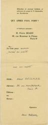 BELLMER HansPièce imprimée avec mots autographes et signée. 9,5 x 24,5 cm. Bulletin de vote intitulé « Qui après Paul Fort ? », à retourner à M. Pierre Béarn. « Je ne vote pour aucun Prince des poètes. Avec mes regrets. » Sur le bulletin, figurent son nom et son adresse.