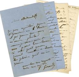 GIRAUD Pierre François EugèneEnsemble de 4 lettres autographes signées, l’une avec dessin à la plume, adressées à Mme Dieudé de Fly. Sans dates ; 7 pages 1/2 in-8°.« Je pars aujourd’hui pour St Germain à 4 heures et j’ai peur que vous ne veniez plus tard. Comme je veux jouir de vous, je serais heureux si votre petit garçon pouvait remettre à demain le plaisir qu’il m’a promis »… « C’est avec la même plume qui vient d’écrire à Viel Castel pour lui demander d’apporter ce soir notre portrait que je viens vous prier de me prêter encore votre petit paletot gris que j’ai déjà grondé une fois et si vous vouliez mettre le comble à vos bontés ce serait de demander à la princesse [Mathilde] de me prêter un jupon rayé rouge ou d’autre couleur pour quelque tems et de remettre le tout au porteur de ce mot. Je vais faire mes anglaises faute de mieux »… « Je ne sais si je dîne ce soir ou lundi chez notre chère Altesse [la princesse Mathilde] soyez assez bonne pour me savoir ce matin les intentions de la princesse à mon égard, elle devait m’écrire et je n’ai rien reçu. Veuillez savoir aussi si j’ai congé pour la leçon. Voilà bien de la peine et je vous en demande pardon. Je profite de l’occasion pour vous faire remettre le portrait tant oublié par le plus dévoué et le plus respectueux de vos serviteurs ». À la suite un petit dessin représente une enfant. [Octobre 1864] : « Comme je suis coupable de ne pas avoir assuré plus tôt réception de votre aimable envoi. Je crois qu’en vous bénissant chaque fois que je fume un de ces bons cigares de cavour cela suffit à la fin ma conscience se révolte et me crie : tu n’es qu’un ingrat maintenant que j’ai fait ma confession et que probablement j’en recevrai l’absolution je vous donne des nouvelles de la maison. La rougeole sévit en ce moment à St Gratien […]. La princesse a toujours l’idée d’aller à Cannes en passant par la Canebière mais je crois que ce voyage ne se fera pas, personne n’y croit si nous étions là peut-être […] profitez bien de votre voyage car la princesse n’est pas prête à vous laisser aller souvent. Vous lui manquerez beaucoup, elle ne croyait pas vous aimer tant que cela nous avons beau lui dire du mal de vous (les absents ayant toujours tord) rien n’y fait. J’ai embarqué Victor pour l’Italie il aurait bien voulu vous voir à son passage à Milan mais ses amis étaient si pressés de voir Venise qu’il est parti trop vite pour pouvoir vous embrasser. Il se dédommagera à Paris. […] Viel Castel a rendu son âme à Dieu, le pauvre diable en mourant a eu une bonne pensée il a en embrassant ses deux pauvres enfants prié le médecin de les mettre sous la protection de la princesse comme il a bien fait ! et qui la connaissait bien ? Primoli vous a remplacé comme liberté de langage et pourrait ajouter un second volume […] compte sur vous pour corriger les épreuves. Je vous prie d’embrasser ce bon Defly pour moi cela vous donnera l’occasion de le faire une fois de plus et vous n’en serez pas fachée. Ma femme qui sait que je vous écrit vous embrasse ainsi que moi à nous deux nous vous aimons de tout notre cœur et voudrions vous le prouver. Amitiés aux enfants, votre tant dévoué, P. Giraud. »