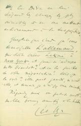 DELIBES LéoLettre autographe signée à un ami. mardi soir, 4 pages in-8°. Léo delibes a auditionné différents chanteurs et se dit abruti de cette journée. « Je suis abruti par ces deux journées concécutives ! Voici les résultats : Les hommes n’ont pas réussis. Rouyer, si c’est celui qui a chanté Oedipe à colonne, au fond est un bon musicien, mais n’a pas une excellente voix. Une autre Rouhier avec un H, a chanté le maître de Chapelle et a été reçu. Serait ce le votre ? Debets a de la voix, mais est tout à fait inculte. Mlle Samé a produit une charmante impréssion par sa jolie voix dans le médium. sa gentillesse et son intélligence. Elle a été reçue d’emblée. Mlle Folcher a de la voix. Mais c’est exagéré et incohérent. rien à faire pour le moment, à moins que vous obteniez de la faire admettre comme auditeur, si un professeur consent à la prendre. Et voila ! Qu’est ce que c’est qu’une demoiselle L’allemand, qui doit créer Lakmé à New-York, et que m’adresse Mlle Viardot ? Est ce la suite de votre négociation ? Dois je la voir ?Elle part jeudi, m’écrit elle, et demain, je n’ai pas une minute. »