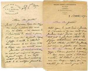 TISSANDIER Albert2 lettres autographes signées, adressées à son frère Gaston Tissandier. Jérusalem, 24-25 septembre et Port-Saïd, 2 octobre 1892 ; 5 pages 1/2 in-8°, en-têtes « Grand New Hotel Jérusalem » et « Grand Hôtel Continental Port-Saïd » (quelques petites déchirures). Inauguration du chemin de fer de Jérusalem. — 24-25 septembre. Arrivé à Jérusalem hier soir, il est réuni avec M. Collas et les administrateurs du chemin de fer, en attendant l’inauguration lundi matin, à Jaffa. « Jérusalem est vraiment extraordinaire. Son aspect est unique en son genre. Un grand nombre de rues voûtées montent et descendent suivant les pentes de la montagne formant le bazar, l’endroit le plus pittoresque qu’on puisse voir. Viennent ensuite tous les curieux sanctuaires pleins de souvenirs bibliques – le Saint Sépulcre avec le tombeau du Christ et le calvaire, la colonne contre laquelle il a été flagellé, l’endroit où on l’a mis en croix, etc. […] Dans la ville ce sont les sanctuaires musulmans qui sont les plus intéressants pour les personnes qui n’ont pas la foi. » Ils feront l’ascension du mont des Oliviers ; hier ils étaient à Bethléem ; « tout cela est poétique et pittoresque ». — 2 octobre. « Notre séjour de courte durée à Jérusalem et l’excursion à la mer Morte et au Jourdain, y compris Jéricho, ont été de touts points du plus haut intérêt. Les paysages extraordinaires et les souvenirs qui sont attachés partout dans Jérusalem sont curieux au possible […]. Nous sommes arrivés à Port-Saïd ce matin, Mr Villard a frété pour nous une barque à vapeur qui nous remontera par le Canal jusqu’à Ismailia. Nous prendrons là le chemin de fer pour le Caire et Alexandrie ». On joint 4 lettres autographes signées et 3 lettres signées à lui adressées par son frère, leur collaborateur Th. Villard (3), l’administrateur délégué du chemin de fer ottoman de Jaffa à Jérusalem et le chef du secrétariat de la Société de travaux publics et constructions (2), toutes relatives au voyage des Tissandier, août-novembre 1892.