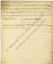 BRISSAC Jean-Paul Timoléon de Cossé-Brissac, duc deLettre autographe signée, adressée à l’abbé Alary, prieur de Gournay et membre de l’Académie française. Paris, 20 septembre 1768 ; 1 page 1/2 in-4°, adresse avec cachet de fermeture avec armoirie sur cire noire. (Ancienne vente Charavay, 1961).Très amusante lettre dans laquelle il regrette que son âge l’oblige à respecter le beau sexe. Il attend avec impatience le retour de son cher abbé « qui seul instrumente ma joye et mon plaisir, car il ne vous manque que des cornettes pour estre ma maîtresse chérie mais je ne vous nourirai que de meringues car je ne veux pas blesser un régime que nos âges exigent, cher abbé ... »
