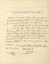 [BEAUHARNAIS Hortense de]Manuscrit. Arenenberg 12 octobre 1837 ; 2 pages in-4° sur papier deuil, marges effrangées et petites déchirures. Récit des obsèques de la reine Hortense, décédée le 5 octobre. Après 4 jours de recueillement dans la chapelle du château d’Arenenberg, le cortège s’est dirigé vers l’église d’Ermätigen. « Le prince Napoléon Louis marchait le premier, et seul, opposant à la douleur un mâle courage, mais trahissant par la pâleur et l’altération de ses traits les angoisses de son cœur déchiré ». Le service funéraire a débuté par l’oraison funèbre de l’abbé Nicolai de Constance, puis après avoir entendu le requiem de Mozart, a suivi deux heures de cérémonie religieuse avant que le cercueil ne soit porté à nouveau dans la chapelle d’Arenenberg. « On attend la réponse du gouvernement français à la demande qui lui a été adressée pour répondre aux vœux exprimés par la Reine mourante. Elle a désiré être ensevelie à Rueil et se reposer à côté de l’Impératrice Joséphine, sa mère ». Une mention d’une autre main dans la marge indique que cet article fut envoyé par Napoléon III [à son ami le bonapartiste Louis Belmontet] L’autorisation de transférer le corps de la reine en France fut accordée et en janvier 1838, eut lieu l’inhumation dans la crypte de l’église Saint-Pierre-Saint-Paul de Rueil- Malmaison.