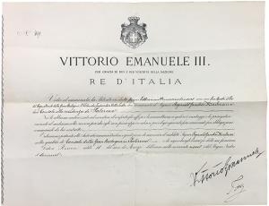 VICTOR-EMMANUEL IIIPièce signée. Rome, 18 mars 1909 ; vélin oblong in-folio en partie imprimé. En-tête imprimé : « Vittorio Emmanuele III - Re d’Italia ». Il nomme M. Reginald Gambier Macbeau, consul britannique à la résidence de Palerme.