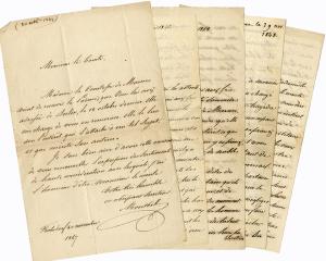[Comte de CHAMBORD] MONTBEL Guillaume-Isidore, baron de5 lettres autographes signées, adressées au comte de Rochelines, lieutenant colonel dartillerie en 1838 attaché à létat-major de Son Altesse Impériale le Grand Duc Michel à Saint-Pétersbourg. 1845-1849 ; 13 pages in-8°.Intéressantes lettres : 1845 : « Jai lu attentivement les memoires que vous mavez fait parvenir et je les ai remis à Madame la comtesse de Marnes : ils font honneur à vos principes politiques, à votre bravoure et à vos talents militaires. Puisque vous me demandez mon avis, jajouterai quil y a toujours de graves inconvénients à montrer au public les faiblesses et les torts des grands personnages encore vivants, par là on risque de leur enlever le respect qui devrait du moins entourer et consoler leur infortune et lon fournit des armes à ceux dont les mauvaises passions repoussent les princes legitimes en leur imputant une nullité absolue de caractère et de capacité [ ]. Il est dans les idées de Monsieur le duc de Chambord dapporter la plus grande réserve dans ses jugements. Surtout à une époque de récrimination tatillonne ». Janvier 1848 : la comtesse de Marnes [la duchesse dAngoulême] a reçu son poème : « Le siècle nest pas poétique. Les hommes de notre époque qui ont le plus de talent ne trouvent pas de lecteurs pour leur publication en vers. Le théâtre est le seul assisté des muses. On écoute languissamment une tragédie plus gaiement une comédie, beaucoup plus volontiers un mesquin vaudeville. Telle est notre époque ! Je suis loin de lui en faire mon compliment. Par suite les journaux se taisent complètement sur les poëmes, parce que leur premier soin est de servir le public en suivant son gout. Monsieur le comte et Madame la comtesse de Chambord sont allés passer lhyver à Venise. Nous en avons de bonnes nouvelles, ainsi que de Madame la Princesse héréditaire de Parme qui se trouvait à Turin. » Vienne, 29 novembre 1848 : « Votre lettre a été remise à Monsieur le comte de Chambord [ ]. Il compte sur la loyauté dont vous avez donné des preuves dans tant de circonstances.[ ] Monsieur le comte de Chambord est un prince instruit dun esprit remarquable, et ce qui vaut mieux encore doué dune grande rectitude de jugement. Ses ennemis ne peuvent pas lui reprocher de fausses démarches. Dernièrement lun deux a lu à la tribune de lAssemblée une lettre du comte de Chambord. Toute lEurope a pu juger de lélévation de ses pensées et de ses sentiments, et jamais pareil ennemi ne fut plus maladroit. Deux camps opposés partagent la société actuelle : lun combat pour lordre, lautre pour le désordre. Lon voit le bien dans la subversion de toutes les institutions sociales, lautre voit le mal dans la destruction de la propriété de la famille, de lautorité gouvernementale ; lun appelle progrès la révolte de Lamberg, à Francfort par lassassinat de Lichnowsky et dAuerswald à Prague par lassassinat de la princesse de Windischgratz, à Vienne par lassassinat de Latour. Lautre appelle ce progrès par son nom, un mouvement rétrograde vers la barbarie des hordes sauvages des forêts [ ]. Ainsi jai vu bon nombre de magnats hongrois soutenir avec un enthousiasme frénétique les progrès de Kossuth qui les a anéantis et en a déjà fait pendre quelques-uns [ ]. M. le comte de Chambord sait que lhumanité progresse nécessairement parce que comme le dit si bien Pascal, lhumanité est un homme qui apprend toujours. [ ] De toutes les stupidités la plus niaise est celle des aristocrates qui applaudissent aux idées dont lapplication est leur anéantissement. » Frohsdorf, 3 février 1849 : il lui annonce quil peut compter sur lintérêt de la comtesse de Marnes et du comte de Chambord et quil ne veut pas de relation avec la famille impériale russe : « Ils ne sont pas en correspondance avec la famille impériale. Ils se sont fait une loi dobserver à cet égard la plus grande réserve. Bien des circonstances leur ont appris que le malheur doit se respecter lui-même et quil ne doit pas se faire accuser dindiscrétion. Nous avons souvent entendu dire : Res sacra miser... mais linfortune doit se tenir à lécart et cest le parti qua pris Monsieur le comte de Chambord, ainsi que son auguste tante. [ ] Puissent les circonstances changer et donner à Monsieur le comte de Chambord la possibilité dutiliser les talents et la loyauté ce sont des qualités qui nulle part ne sont en assez grande abondance pour quelles soient negligées par un prince intelligent. Lannée 1848 a produit des événements terribles et dutiles enseignements. Ce qui sest passé en Autriche est digne de meditation. Un empire dissous en un instant par des pédants et des folliculaires, et reconstitué rapidement par lénergie des troupes et la fermeté des chefs. Cest lorganisation et la discipline triomphant de lanarchie. En France je crains bien que lanarchie nait le temps de faire encore bien du mal. »