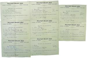LALO ÉdouardPièces signées par des compositeurs. Sans date ; 1 page in-8° oblongue chaque. En-tête imprimé « Monument Édouard Lalo ». Bulletins de souscription au monument Édouard Lalo, par le statuaire Maurice Quef. Ont rempli et signé sur chaque bulletin : Henri Rabaud, Paladilhe, Georges Hüe, Théodore Reinach, Jules Lemaître. On joint les bulletins de souscription autographes (mais non signés) de Camille Saint-Saëns, Reynaldo Hahn, Gustave Charpentier. Bon ensemble.