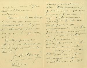 FAURÉ GabrielLettre autographe signée. Vendredi ; 3 pages in-8°. Gabriel Fauré annonce « qu’il a le dernier salut de L’Adoration Perpétuelle à la Madeleine et que je pourrais arriver chez Pleyel que longtemps après le quatuor !! J’en suis extrémement contrarié. »