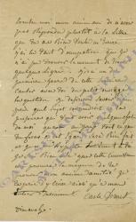 VERNET Carle (Charles-Horace, dit)Lettre autographe, signée « Carle Vernet », adressée à un ami, M. Le Brun, habitant rue du Gros-Chenet n°4 à Paris, « dimanche » [29 septembre 1811] ; 1 page in-8°. « Excusez-moi mon ancien ami de n’avoir pas répondu plus tôt à la lettre que vous avez bien voulu m’écrire. J’ai eu tant d’occupations que je n’ai pu trouver le moment de tracer quelques lignes. J’irai un des premiers jours de cette semaine causer avec toi du petit ouvrage en question. Je désirerais savoir à peu près quel sujet conviendrait à la personne qui veut avoir quelque chose de moi ; quant au prix tout ce que tu feras à cet égard sera bien fait et je m’en rapporte entièrement à toi. Je suis bien aise que cette circonstance me procure le moyen de te prouver mon ancienne amitié, je te prie d’y croire ainsi qu’à mon entier dévouement. »