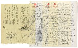 DELOUCHE DominiqueLettre autographe signée, adressée sa « Chère Nina » [Nina Vyroubova]. Sans date ; 5 pages in-8°, en-tête « Carlton Hôtel — Cannes ». Cette lettre est agrémentée d’un dessin au stylo noir représentant une danseuse en tutu. « Voici les raisons pour lesquelles juillet était préférable : 1° Labis était en vacances le 3 juillet, 2° Lifar quitte Nice pour l’Italie au même moment. L’opéra ferme en août et Julien peut y trouver un prétexte à ne pas ouvrir les grilles de la façade. Mais évidemment si vous n’êtes pas là, il faudra s’arranger en sept. Laissez-moi tout de même préférer pour la dernière semaine de juillet […]. Ne vous inquiétez surtout pas, nous y arriverons bien, mais le plus tôt sera le mieux, aussi parce que j’aimerais être prêt pour le Festival de Venise qui a lieu fin août, qui est le dernier festival de l’année. Je vous écris de Cannes où je suis le Festival comme critique. Le 24, je fais une petite projection de notre film. Puis il est question pour moi d’aller à Londres quelques jours. Pour le décor, remerciez bien M. Guerico. Je ne dis pas non mais je me demande si le décor ira au Châtelet et aussi s’il n’arrivera pas plus tard que vous. J’avais prévu de demander un décor à Léonor Fini. Ce serait merveilleux. Elle est d’accord mais il reste à entendre les conditions. Je pense de toutes façons en faire une projection fixe su le cyclorama. Cela sera très suggestif et d’une exécution peu coûteuse. Levasseur m’a donné la maquette de costume pour l’opéra. C’est éblouissant. […] J’ai vu Lifar. Nous vous réservons une surprise. Je lui ai proposé de rajouter un très court adage avant la variation. Nous avons la musique. Il est enchanté. »On joint une pièce autographe, adressée à la même, avec 1 dessin au crayon noir représentant deux danseuses.