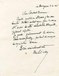 CIRY MichelEnsemble de 5 lettres autographes signées, adressées au peintre Constant Baruque. De 1964 à 1967 ; formats in-4°, enveloppes jointes :— « Voici la dédicace. Je vous avais répondu à vos voeux, par mon arlequin, messager des miens »,— « Vous recevrez par le même courrier le catalogue des P.T.T. Le plus simple pour vous sera de m’envoyer à l’occasion la correspondance de 6 Frs de timbres. »— « Merci de tout pour les voeux et l’envoi de cette délectable blanquette, justement réputée. Je garde précieusement le dessin. »— « Je vous ai renvoyé, dédicacée la reproduction que vous m’avez adressée, y joignant la réponse à vos sympathiques voeux. »— « Je vous remercie pour vos bons voeux et m’excuse d’y répondre tardivement. Des voyages et de sérieux soucis. »On joint 2 lettres autographes signées de sa mère.