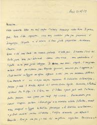 MARCHAND AndréLettre autographe signée, adressée à André Jolivet. Voulaines-les-Templiers, le 7 mars 1969 ; 1 page in-4°.« En travaillant dans mon atelier de Bourgogne, ce matin, j’écoutais votre émission sur Berlioz. Conférence donnée par vous à la maison de la culture de Grenoble. Dont le thème était le traité d’orchestration de Berlioz. Vous savez combien j’aime la musique que je considère très près de la peinture, pour moi, les couleurs sont des lumières et des sonorités dans une architecture. Je vous adresse ce mot pour vous dire la joie que j’ai eue en vous écoutant (tout en travaillant). Ces études sur les architectures sonores sont très importantes, c’est justement ce que l’on doit diffuser dans les milieux de la jeunesse actuelle. Qui est très attentive (contrairement a ce que croit une certaine bourgeoisie). Berlioz évidemment est une source riche. J’ignorais que Berlioz aimait tellement la guitare !! Merci, cher Jolivet, pour cette matinée d’étude. »