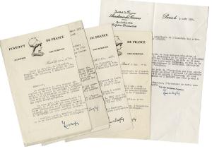 BROGLIE Louis de9 lettres signées, adressées à Lucien Scheler. 1956-1961 ; 8 pages in-8° et 1 page in-4° à en-tête « Institut de France, Académie des sciences », enveloppe jointe. Comme secrétaire perpétuel de l’Académie des Sciences, la plupart remerciant pour la communication de lettres inédites de Lavoisier, à insérer dans la correspondance en préparation. Textes intéressants.