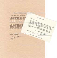 SIMENON Georges2 pièces signées :— Extrait tiré de Aboard the Aquitaine. 1/2 page in-4° sur papier saumon, en anglais. « And what about the stolen wallet ?… No one was ever sure, although Grenier was arrested two years later for the same sort of theft, in a large hotel in Deauville. »— Carte autographe signée. 14 janvier 1987 ; 1 page in-16 oblongue, en anglais. « Many thanks for your letter and for the little heap of work you gave me to do. If all booksellers were like you I would spend my life writing signatures and the printing of my books would multiply by I don’t know what figure. You are the most entreprising [sic] and active bookseller I know. »