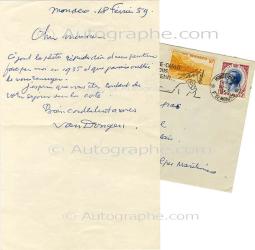 VAN DONGEN Kees (Cornelis Theodorus Marie, dit)Lettre autographe signée, adressée à M. Depas. Monaco, 18 février 1959 ; 1/2 page in-12, enveloppe timbrée jointe.« Ci joint la photo reproduction d’une peinture faite par moi en 1935 et que j’avais oublié de vous renvoyer. J’espère que vous êtes content de votre séjour sur la côte. Bien cordialement, Van Dongen. »