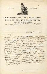 STAPFERLettre autographe signée en tant que ministre des Secours de la République helvétique, adressée au citoyen Girard, cordelier à Fribourg. Lucerne, 8 février 1799 ; 1 page 1/4 in-folio. En-tête imprimé avec jolie vignette gravée représentant Guillaume Tell et un enfant. « J’ai conçu une haute idée de vos talents, vos lumières et vos principes. Mon archiviste me quitte. Cette place rapportera à peu près 100 louis, probablement davantage. Le mécanisme de mon bureau se réduit à peu de choses. L’archiviste a toujours beaucoup de temps de reste pour se livrer à des travaux de tête et à des recherches intéressantes. Il doit d’ailleurs par la nature de sa place devenir dans la suite le conservateur du dépôt de tout ce qui concerne les arts et les sciences de notre nation. »
