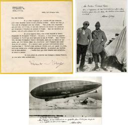 NOBILE UmbertoSuperbe lettre signée d’Umberto Nobile, adressée au docteur Fossier. 6 février 1969 ; 1 page in-4°, collée sur carton.« Vous pouvez bien comprendre que pour moi, ici à Rome, il est bien difficile de décider les questions qui concernent l’érection du monument à Tromsö. […] Si je me rappelle bien, vous m’avez demandé un dessin d’ensemble du dirigeable Italia. Ci-joint, je vous envoie un pamphlet concernant le “N°1”, qui plus tard prit le nom de Norge. Dans l’ensemble ces deux dirigeables étaient identiques, sauf pour la cabine de commande, que j’ai réduite dans ces proportions pour l’adapter aux conditions du vol polaire ».On joint une photographie d’Umberto Nobile soutenu par Alfredo Viglieri devant la tente rouge (220 X 310 mm - retirage), signée par Alfredo Viglieri dédicacée au Dr Fossier : « Avec l’expression de ma reconnaissance pour faire revivre, après bien des ans, les souvenirs d’une aventure exaltante. » Une autre photographie (355 X 235 mm - retirage) représente le dirigeable Italia dans un paysage arctique avec l’envoi autographe signé de Alfredo Viglieri : « Avec l’expression de mes sentiments de vive sympathie pour l’intérêt que vous portez à la conquête des airs et de l’espace. ». Cette même photographie (355 X 235 mm - retirage) représentant le dirigeable Italia dans un paysage arctique avec un autre envoi. Ensemble captivant.
