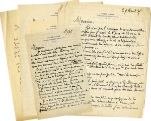 RHENÉ-BATON (René Baton, dit)Correspondance de 6 lettres autographes signées, adressées à M. Templier, du Figaro. 1935-1937 ; 7 pages in-8° ou in-4° ; 2 lettres effrangées.25 août 1935 : « J’ai pris connaissance des lignes que vous consacrez au concert que je dirige ce soir à Radio-Paris. Elles m’ont fait grand plaisir, et je suis très flatté du titre de “Serviteur de la musique” que vous me décernez. J’ai toujours eu pourtant de servir la musique de mon mieux ». 13 octobre 1935 : il a dû céder la place à l’Opéra pour le centenaire de St-Saëns et son concert a été reporté. 28 novembre 1935 : « La Direction de la Radio m’a prié de diriger régulièrement , chaque mois, un concert de nuit, relayé par les principaux postes en France, dont Radio-Colonial. » 16 janvier 1936 ; Il le remercie pour les termes si élogieux pour son dernier concert. 25 août 1937 : « Mon pauvre et cher grand ami Albert Roussel est mort, et en mémoire de ce grand disparu, je remplacerai les 4 Esquisses pour le piano de Schumann par la Sarabande de la Suite en fa et l’Adagio de la 3e Symphonie - à mon concert d’après demain ». 28 août 1937 : « Ce fut émouvant, hier soir. L’orchestre, très ému, a donné une exécution admirable de la Sarabande, de la Suite en fa, et de l’adagio de la 3e symphonie »
