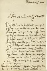 ZIEM FélixLettre autographe signée. dimanche, 18 mars ; 1 page in-4°. Il demande de reprendre le tableau “ Gallipoli ” pour l’exposition Petit. « Mon tableau de “ Gallipoli ”que vous possedez est évidement une des bonnes choses que j’aie produit, aussi vous m’obligerez beaucoup si vous consentiez à le laisser exposer à l’Exposition Petit. Soyez assez aimable pour vous en priver quelques temps, et vendez moi ce dernier. Si en remplacement pour combler une place désagréable dans votre appartement vous désirez une esquisse encadrée et de même grandeur je serai trop heureux de la mettre à votre disposition ».