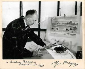 BRAYER YvesPhotographie signée, adressée au peintre Constant Baruque. 180 X 130 mm. Photographie le représentant en train de peindre dans son atelier, collée sur un support et dédicacée en dessous : « à Constant Baruque , cordialement 1970 Yves Brayer. » Rare.