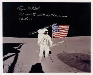 MITCHELL Edgar D.Photographie en couleur dédicacée. 204 X 255 mm. Photographie de la NASA montrant E. Mitchell sur la Lune à gauche du drapeau Americain planté sur la surface lunaire. « Edgar Mitchell 6th man to walk on the moon Apollo 14 ».