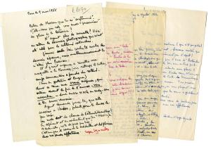 BEZOMBES Roger5 lettres autographes signées, adressées au compositeur André Jolivet. 1952-1966 ; 5 pages 1/2 in-4°.Au sujet d’un texte d’André Jolivet [pour L’Exotisme dans l’art et la pensée par Roger Bezombes, 1953], lui conseillant d’élargir le paragraphe historique, craignant que le public soit surpris de ne pas voir citées certaines œuvres exotiques de Saint-Saëns, Boieldieu, Lully, Rameau, Félicien David, Moussorgski, Tchaïkovski, Gluck, Albert Roussel, Bartók, etc. Remerciements pour l’envoi du disque des Pastorales de Noël, félicitations pour ses succès à Moscou, souhaits d’anniversaires, etc.