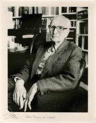 LÉVI-STRAUSS ClaudePhotographie originale de l’ethnologue assis dans un fauteuil. 30,5 X 24 cm. La photographie tirée sur papier baryté argentique mat à tout petit tirage (entre 1 et 5 ex.) a été réalisée par Bruno de Monès, septembre 1985. Faite pour le Magazine Littéraire. Elle est signée par le photographe au recto et au verso (« Épreuve d’artiste »).