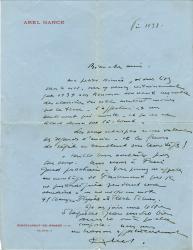 GANCE AbelLettre autographe signée, adressée à M. et Mme Tedesco. « Fin 1938 » ; 1 page in-4° sur papier bleu à son nom gravé en rouge. « Ma petite Aimée, si vous lisez dans le ciel, vous y verrez certainement que 1939 nous trouvera vous deux ensemble. Les clairières du ciel mentent moins que la terre, l'affection est un sentiment qui monte et qu'on ne trouve donc que là-haut. Les deux écharpes nous valent des regards d'envie [ ]. Mille bons souhaits pour tous deux. Nous serons à Paris jeudi prochain. Vous pourrez m'appeler au montage de Paramount que je ne quitterai guère pendant une semaine ou me mettre un mot 95 Champs Élysées à Flora Films. [ ] Nous vous embrassons affectueusement. Abel. »