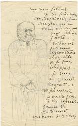 COUDOUR HenriLettre autographe signée, avec dessin, adressée à son filleul. Sans date ; 2 pages in-8°. Dessin en vis à vis du texte le représentant enchaîné. « Je ne puis mieux vous exprimer mon désespoir qu’en vous envoyant ma dernière photo. Enchaîné par une circonstance à laquelle je ne puis échapper, je suis au grand regret de ne pouvoir prendre part à la réjouissance si gentiment proposée par vous ».Après quelques années d’étude passées à Lyon où il s’était lié d’amitié avec Régis Gignoux et Léon Werth, était venu se fixer à Montmartre au tout début du XXe siècle. Il avait connu et fréquenté Degas, avait été l’ami de Georges Delaw, imagier de la reine, du dessinateur Pierre Falké et était connu et aimé de tous les artistes de Montmartre.Il fut aussi un grand ami de Dunoyer de Segonzac.