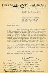 QUENEAU RaymondEnsemble de 3 lettres signées, dont l’une avec 5 lignes autographes, adressées au philosophe Yvon Bélaval. 1944-1947 ; in-8° et in-4°. En-têtes de « la Librairie Gallimard, NRF. »— 5 juin 1944. « Nous demandons donc l’autorisation à la Commission de contrôle pour Recherches puisque c’est le titre que vous nous indiquez (et bien que je ne le trouve pas encore très bon) ; d’ailleurs j’ai beaucoup mieux apprécié les deux premières parties que la troisième. »— 24 octobre 1944. « J’ai lu La Rencontre avec Max Jacob que vous avez bien voulu m’envoyer. En toute franchise, je ne crois pas que la publication s’en impose. Il y a déjà plusieurs projets de livres sur Max Jacob par des personnes qui l’ont très bien connu. D’autre part, nous comptons publier Les Méditations dont vous donnez des fragments dans votre dernier chapitre. Je pense donc que ce manuscrit pourrait intéresser une revue, mais ne saurait faire l’objet d’une édition. »— 18 juin 1947. « Nous prenons d’une manière ferme le manuscrit de Sachs. Pouvez-vous nous le réserver et ne le communiquer à aucun autre éditeur ».