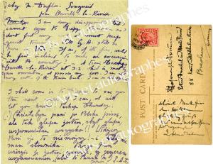 ALMA-TADEMA Sir LawrenceEnsemble de 3 cartes autographes signées.2 cartes sans vues ; la troisième représentant une photographie du peintre devant son chevalet. Deux des cartes (rédigées en allemand et en polonais) sont envoyées à Mme E. Henschel 9 rue Agnado à Dieppe. La troisième écrite en anglais (datée de 1911) est adressée à Esther Henschel et à la cantatrice Maria Freund [1876-1966] à Breslau. Dans l’une des cartes il remercie des vœux reçus pour son anniversaire. Dans une autre, il regrette de n’être pas assez bien pour rejoindre Esther Henschel à Dieppe, mais il lui donne l’horaire du train au cas ou G.H ( ?) encore là, voudrait faire une excursion vers Ouville-La-Rivière, le mercredi suivant.