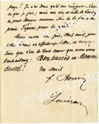 BONVIN FrançoisLettre autographe signée, adressée à son ami Louis Martinet (directeur du Théâtre Lyrique). Saint-Germain, 1er janvier 1880 ; 2 pages in-12. Vœux de nouvel an et félicitations pour « votre succès très brillant de Paul et Virginie [de Victor Massé]. De pareils triomphes valent mieux qu’une subvention ! ». Il est devenu incurable : « je dois garder la Chambre indéfiniment (comme Gambetta). [...] Je me cramponne au travail. Je peins au pied de mon lit ; mais tout cela ne rapporte guère, puisque plus je produis moins on me paye ! Je n’ai donc qu’à me résigner »...