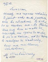 KANDINSKY NinaLettre autographe signée de Nina Kandinsky, adressé à M. Braun. 12 avril 1962 ; 1 page in-4°. « Ci-joint votre carte postale avec les indications. Le titre de ce tableau est La Flèche. Vous serez bien aimable de m’envoyer une dizaine de cartes. Le N° de ce tableau est 711 d’après le catalogue de Kandinsky. »