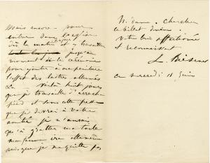 RIESENER Louis Antoine LéonLettre autographe signée, adressée à Octave Feuillet. « Ce mercredi 11 juin » ; 2 pages 1/2 in-8°. « Je suis bien inquiet que vous ne vous fassiez sceller comme on dit et que vous n’oubliez au milieu de tous les tracas que vous avez le billet de passe que vous avez promis à ma femme pour moi. J’en ai besoin non seulement pour voir la cérémonie du point de vue que j’ai choisi […], mais encore pour entrer dans l’église dès le matin de ce jour et y travailler jusqu’au moment de la cérémonie pour ajouter à ma peinture l’effet des lustres allumés », etc.