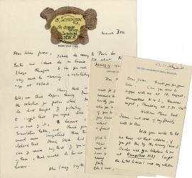 SPENDER StephenEnsemble de 3 lettres autographes signées, adressées à Julien Green. Londres « 30 mars » ; 1 page 1/2 in-4° avec en-tête illustré à ladresse du « 15, Loundoun Rd ». En anglais.Concernant la traductions de certains de ses poèmes.Devant se rendre à Paris, Spender se propose de renouer avec Julien Green une relation commencée des années plus tôt à Oxford. Max-Pol Fouchet [1913-1980] désire publier une sélection de ses poèmes dans la revue Fontaine. Il serait honoré que Green veuille bien accepter de traduire tout ou une partie de son recueil : « I feel that if you would carry over something of the literal imagery and meaning of my poems into a form which comes simply and naturally to you - this is far more important than reproducing the rhyme and pattern of the original, which nearly always looked forced in another language. » Les deux autres lettres, sont relatives à des invitations à dîner ou déjeuner (1930).