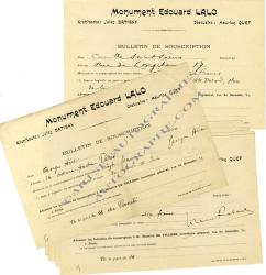 Sur LALO ÉdouardPièces signées par des compositeurs. Sans date ; 1 page in-8° oblongue chaque. En-tête imprimé « Monument Édouard Lalo ». Bulletins de souscription au monument Édouard Lalo, par le statuaire Maurice Quef. Ont rempli et signé sur chaque bulletin : Henri Rabaud, Paladilhe, Georges Hüe, Théodore Reinach, Jules Lemaître. On joint les bulletins de souscription autographes (mais non signés) de Camille Saint-Saëns, Reynaldo Hahn, Gustave Charpentier. Bon ensemble.