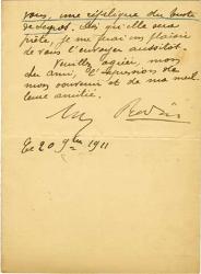 RODIN AugusteLettre signée, adressée à Achille Segard. « Ce 20 9bre 1911 » ; 1 page 1/2 in-8°. « Tous mes remerciements pour avoir bien voulu consentir à me céder le buste de Legros que je vous avais donné en échange de votre Carpeaux et qui appartenait au Musée de Bruxelles. Je l’ai fait prendre ce matin et je vais l’envoyer en Belgique. Quant à la demande que vous me faites de vous donner un Puvis à la place d’un Legros, lorsque j’ai reçu vos lignes, j’avais déjà commandé spécialement pour vous une réplique du buste de Legros. Dès qu’elle sera prête, je me ferai un plaisir de vous l’envoyer aussitôt. »