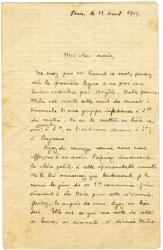 PHILIPPE Charles-LouisLettre autographe signée, adressée à des amis. Paris, 18 avril 1909 ; 1 page ½ in-8°, papier quadrillé.Prenant ses précautions, il annonce la tragique nouvelle de la mort de sa maîtresse Milie : « Ne criez pas en lisant ce mot, pensez dès la première ligne à ne pas vous laisser entendre par Angèle. Notre pauvre Milie est morte cette nuit de samedi à dimanche d’une grippe infectieuse à 2 h du matin […] Préparez doucement la chère petite à cette épouvantable nouvelle. Ne la lui annoncez que lentement […] Elle est ce qui me reste de cette si bonne, si aimante, si dévouée Milie ». Lui-même mourra sept mois plus tard.