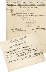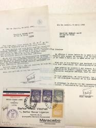 VACHET PaulIntéressant ensemble de 5 documents : 2 lettres signées par Paul Vachet. 1 enveloppe affranchie avec timbres du Venezuela oblitérés du 14 avril 1930 avec la signature de Paul Vachet sur l'enveloppe. 1er vol Caracas-Maracaïbo. 1 lettre à en-tête de la Société Industrielle d'aviation Latécoère dactylographiée et signée par Beppo di MASSIMI [Bari, Italie, 1875 - Saint-Ay, 1961], un des tout premiers collaborateurs de P G. Latécoère. 1 lettre signée par le Directeur Administrateur de la Société Aéronautique Française, à propos des avions Dewoitine. Lot très intéressant.