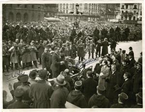 COSTES ET BELLONTETrès grande photographie signée par les deux pilotes. 18 X 23 cm, petits plis dangles. Photographie du NewYork Times montrant la foule autour des deux pilotes sur une place française.