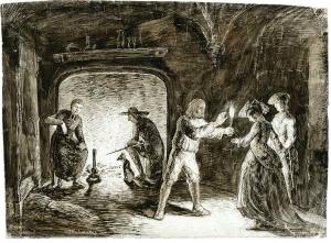 SAND Maurice (Jean-François Maurice, baron Dudevant, dit)Scène d'intérieur devant une cheminée. Dessin à l'encre et craie. Daté : « Nohant 1843 ». Signé « M. Sand » en bas à gauche. 22,8 x 30, 80 cm.