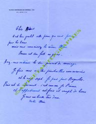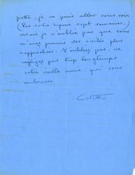 COLETTELettre autographe signée à son ami Chauveau. 2 pages in-4° sur papier bleu. Colette remercie son ami de lui avoir une carte qui annonce un mariage d’un de ses fils. « C’est une bonne nouvelle que m’apprte cette carte. Encore un jeune Chauveau de marié! Encore de jolis petits Chauveau en perspective ! Des petits Chauveau pour augmenter le groupe photographique que vous manquerez pas de m’envoyer ! Je souhaite que vous soyez tous heureux. Tenue par la patte, je ne puis aller vous voir. ( Pas sortie depuis sept semaines...) mais je n’oublie pas que vous m’avez promis des visites plus rapprochées. N’oubliez pas, ne négligez pas trop longtemps votre vieille amie qui vous embrasse. »