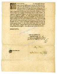 VALOIS Louis deLettre signée « Louis de Valois », adressée à M. de Tambarlet. Aix, 11 mars 1647 ; 1 page in-folio, adresse avec cachet de cire aux armes, sur lacs de soie noire.Convocation de la noblesse de Provence pour armer la province contre les entreprises ennemies : la prise d’un espion du Gouverneur de Milan a confirmé un projet de campagne contre quelques places de la côte.